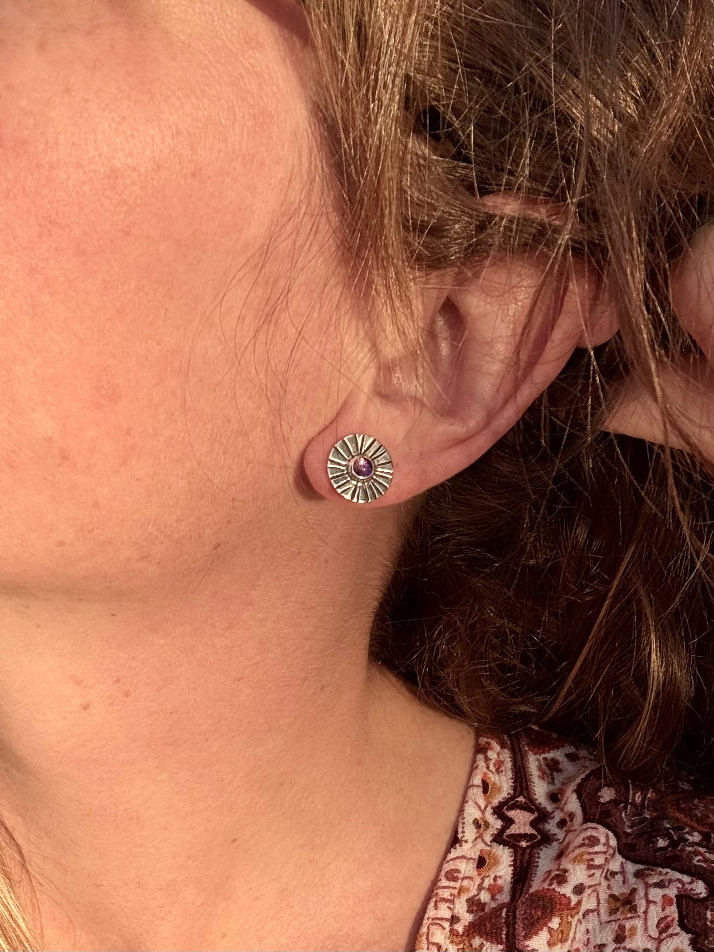 4mm amethyst cabs showcased in hand stamped .925 sterling silver studs.