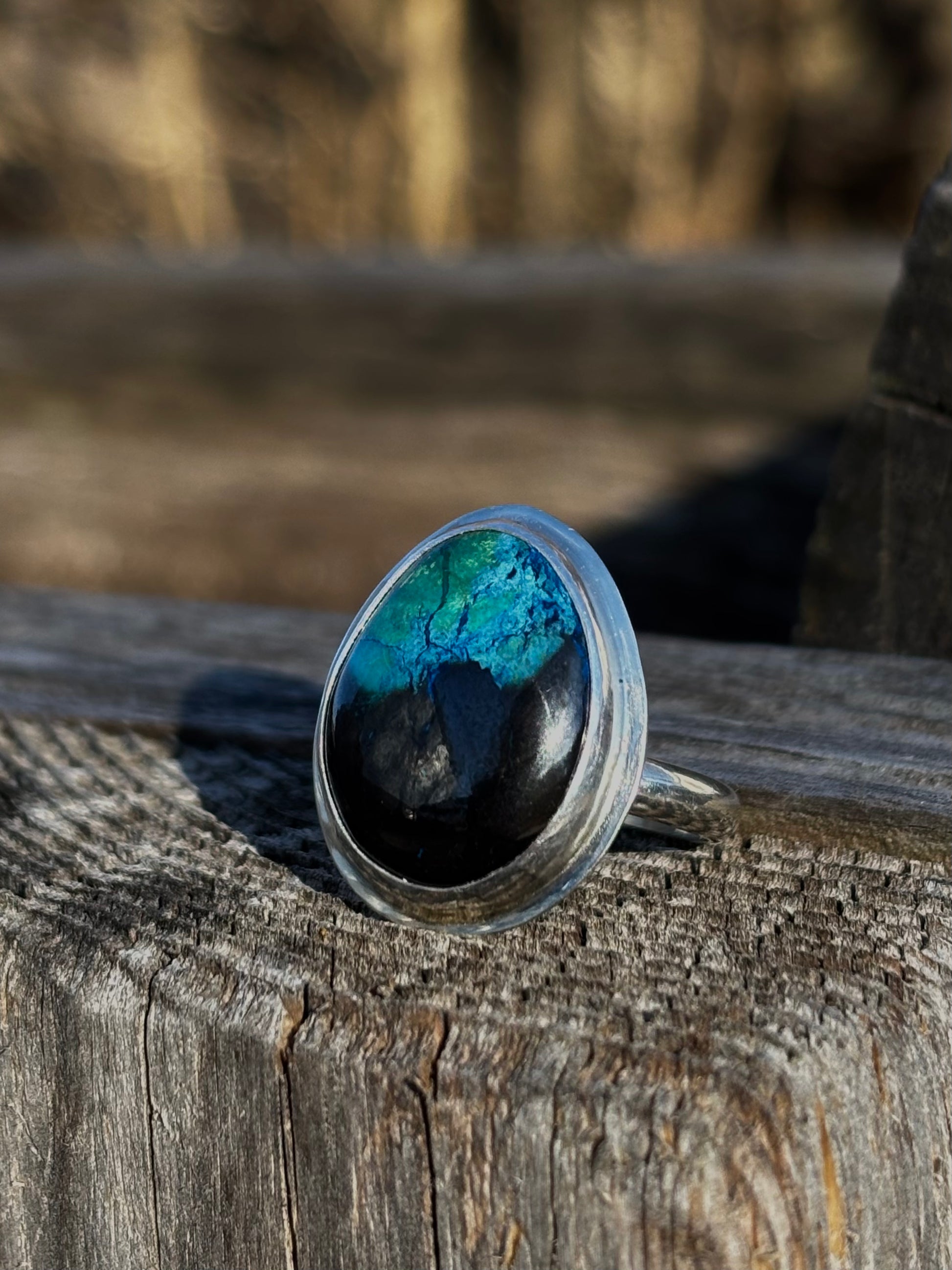This stone from the Bisbee Mine in Arizona contains multiple elements- Bisbee, azurite and shattuckite. The bright blue and green in the stone pop dramatically against the almost black bottom. It is wrapped in a .999 fine silver bezel and sits as a size 9 on a .925 sterling silver band.