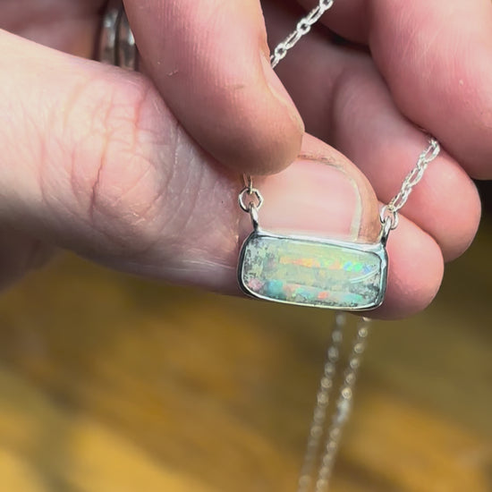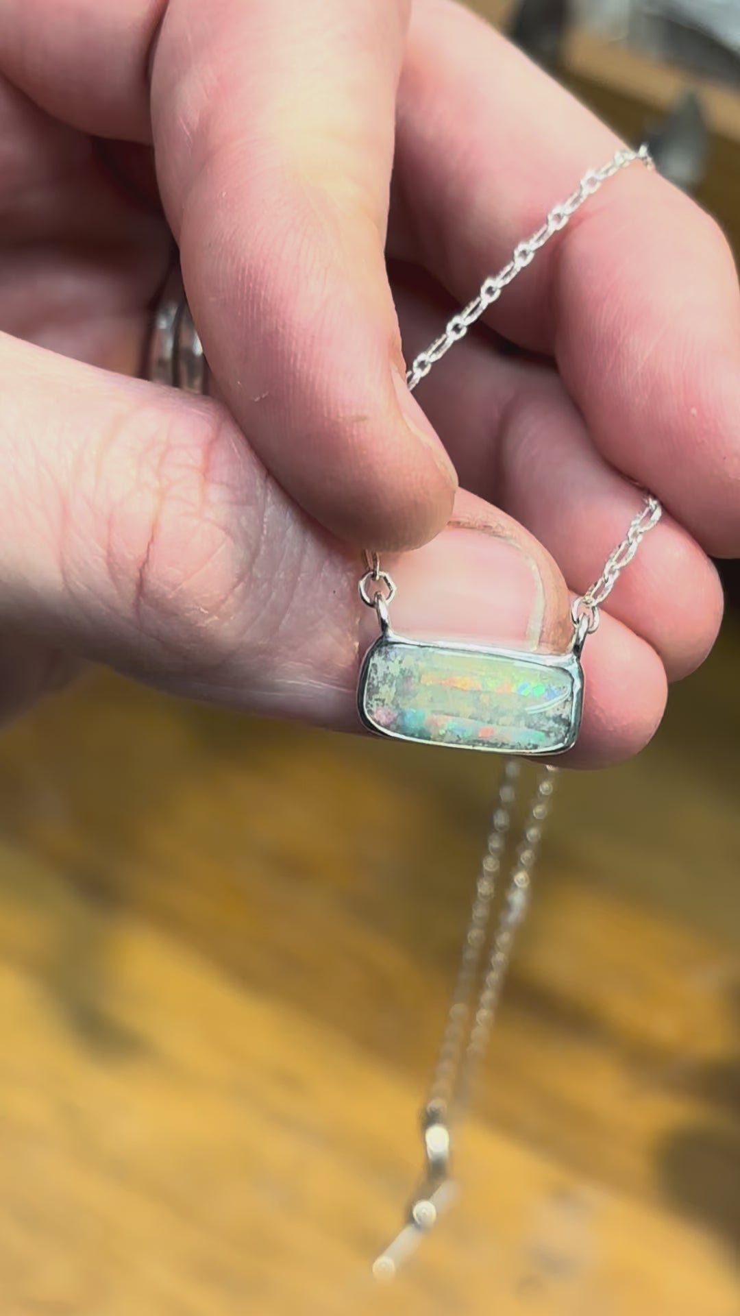 This tiny but mighty Australian Boulder Opal is serving up sass with its extreme color play. It sits comfortably and closely on the neck on an almost 16” chain with a toggle clasp.