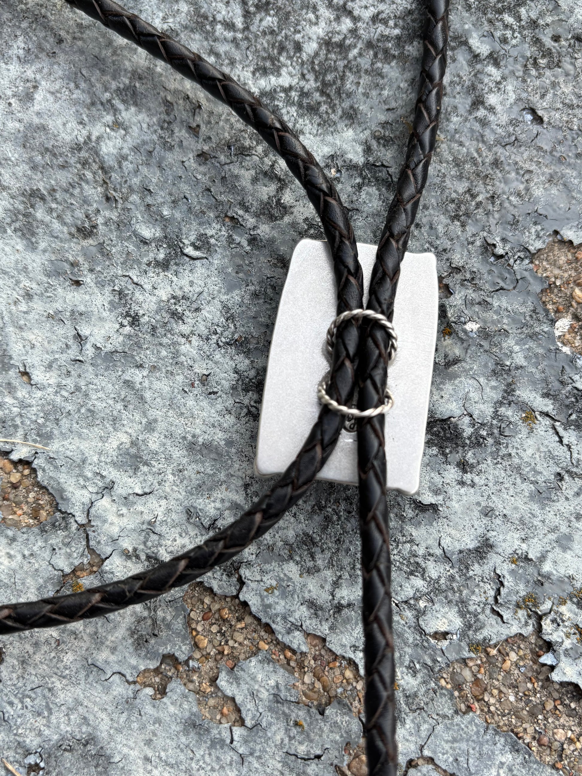 Half an ounce of sterling silver decorated and holding this electric boulder opal. On a genuine black leather corded tie, this bolo tie demands attention with its sharp and stunning bolt of blue.