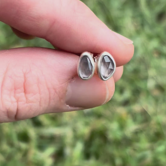 Sweet rosecut light lavendar zircon stones sitting in fine silver bezels and .925 sterling silver backplates and studs.