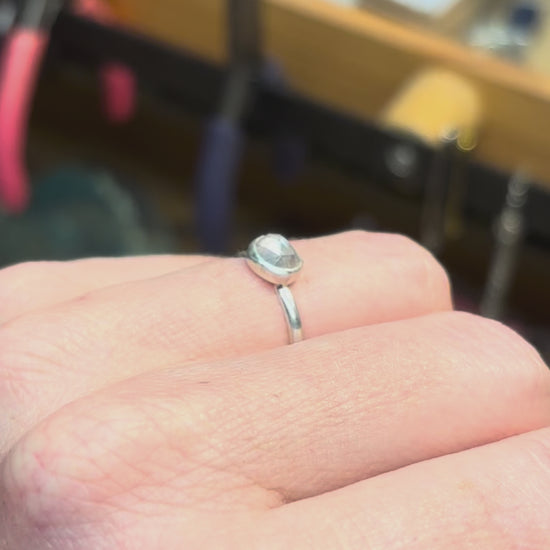 Size 7.5 clear rosecut zircon ring matches beautifully with a stacking set. It is .925 sterling silver.